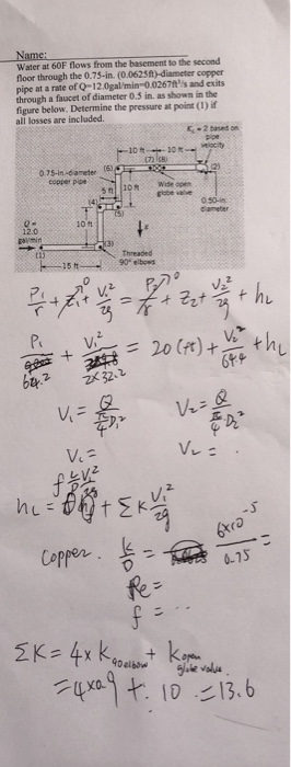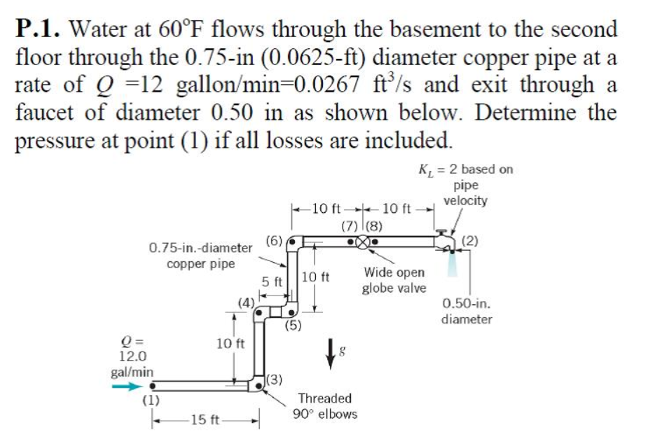 Water At 60 F Flows From The Basement To The Second Floor Through The 0 75 In 0 0625 Ft Diameter Copper Pipe A Drawn Tubing At A Rate Of Q 12 0 Gal Min 0 0267 Ft 3 S And Exits Through A